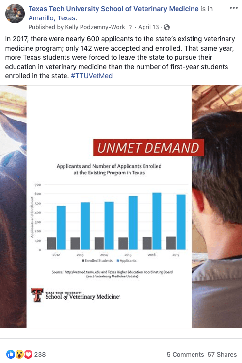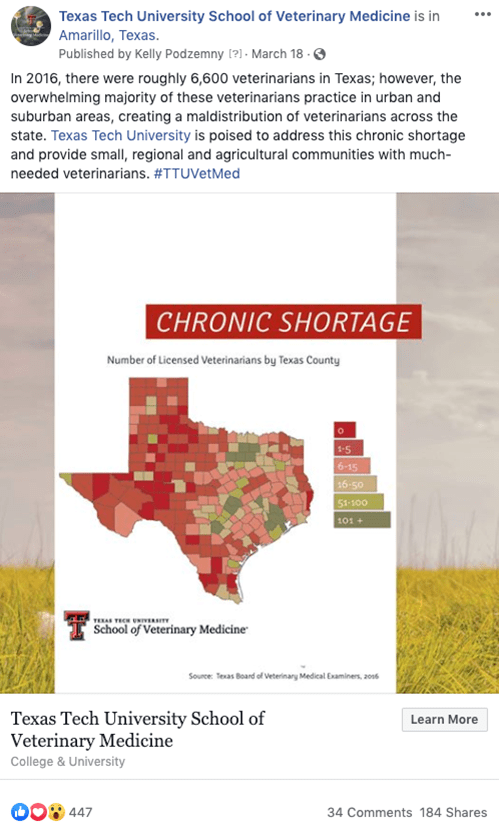 From Oct. 2018 through Jan. 2020, I served as social media manger and local news contact for the new Texas Tech University School of Veterinary Medicine in Amarillo. I also helped coordinate the larger strategic communication campaign targeting both donors and policy makers. The content we published was intended to encourage community and legislative support for the new school while it was still merely a proposal.